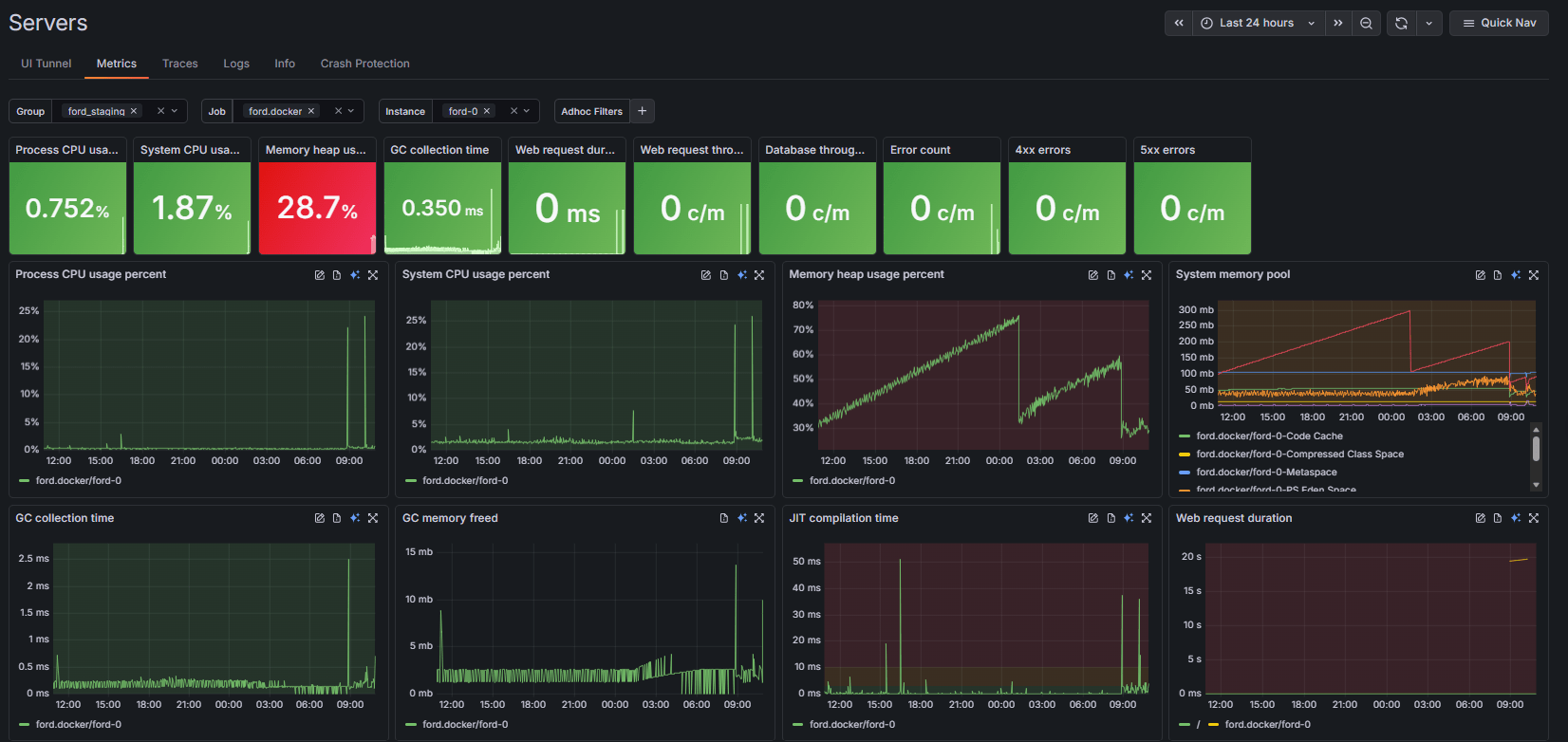 FusionReactor Cloud uses a clear and intuitive health-state color system. Healthy systems render all tiles in green, while anomalies stand out sharply in red. For example, if your CPU and Memory are performing well, those tiles remain green, but a sudden spike in Web request duration will trigger a bright red warning tile. This makes problems impossible to miss, even when you are monitoring dozens of servers at once.