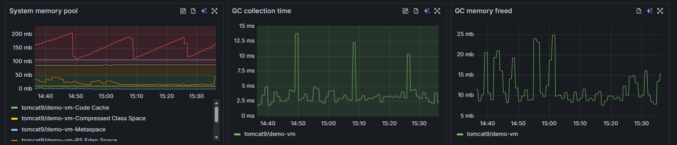 - Hover for Precision: Hovering over any line, such as a specific Tomcat instance in the memory pool graph, shows the exact value and timestamp.
